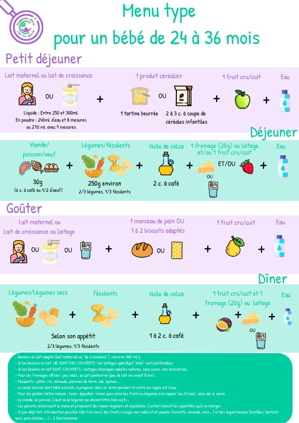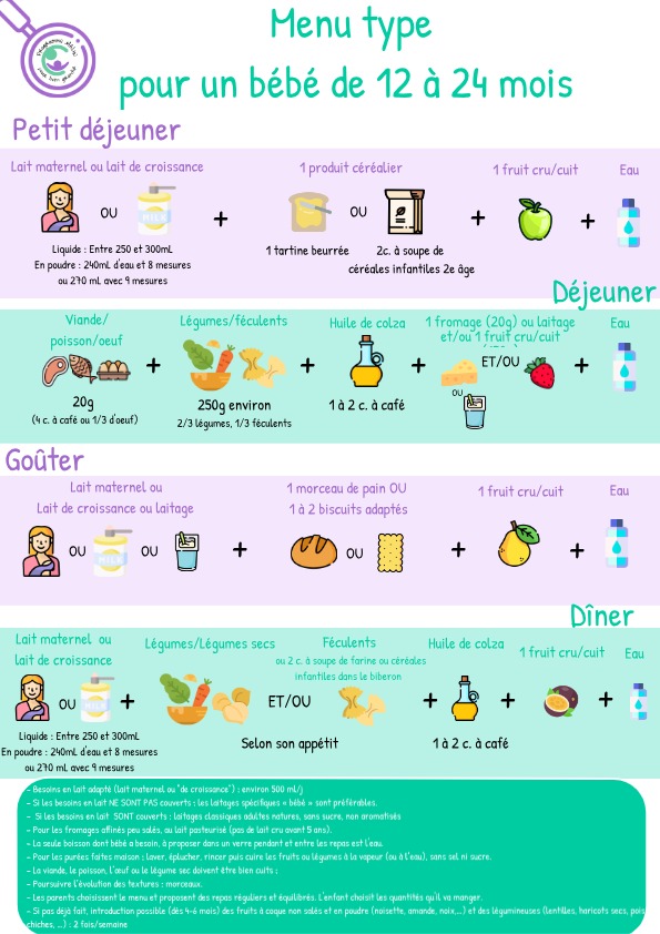 – Les conseils fournis dans ces fiches sont des repères nutritionnels, et non des règles strictes. Il est essentiel d’écouter l’appétit de votre enfant et d’observer ses réactions. Les quantités indiquées sont indicatives et peuvent varier en fonction de chaque bébé.
